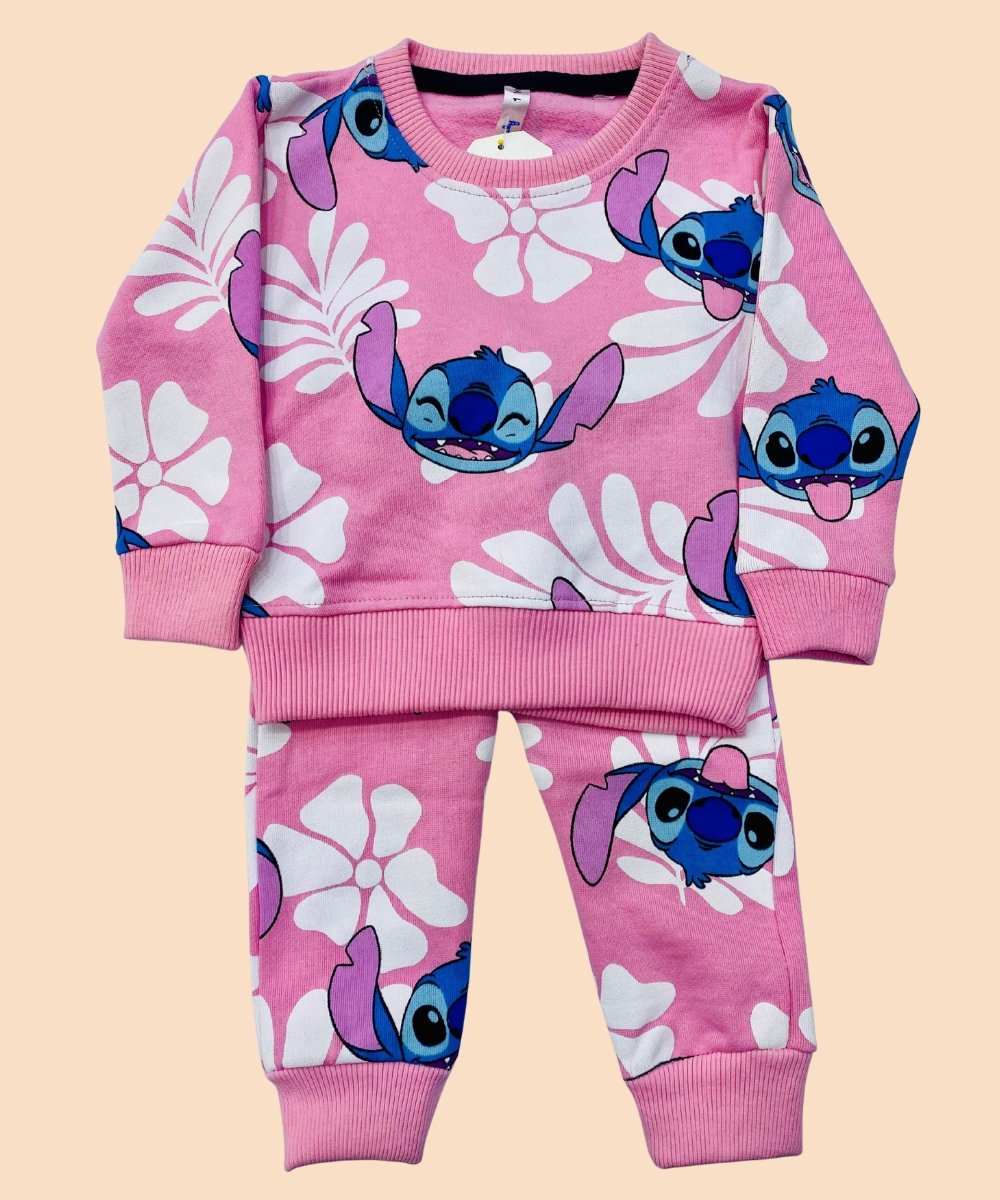 An adorable and comfy 2-piece girls outfit featuring a playful cartoon character print on a soft long-sleeve sweatshirt with matching elastic waist pants. Perfect for everyday wear, playtime, outings, and cozy comfort with a fun, stylish touch.