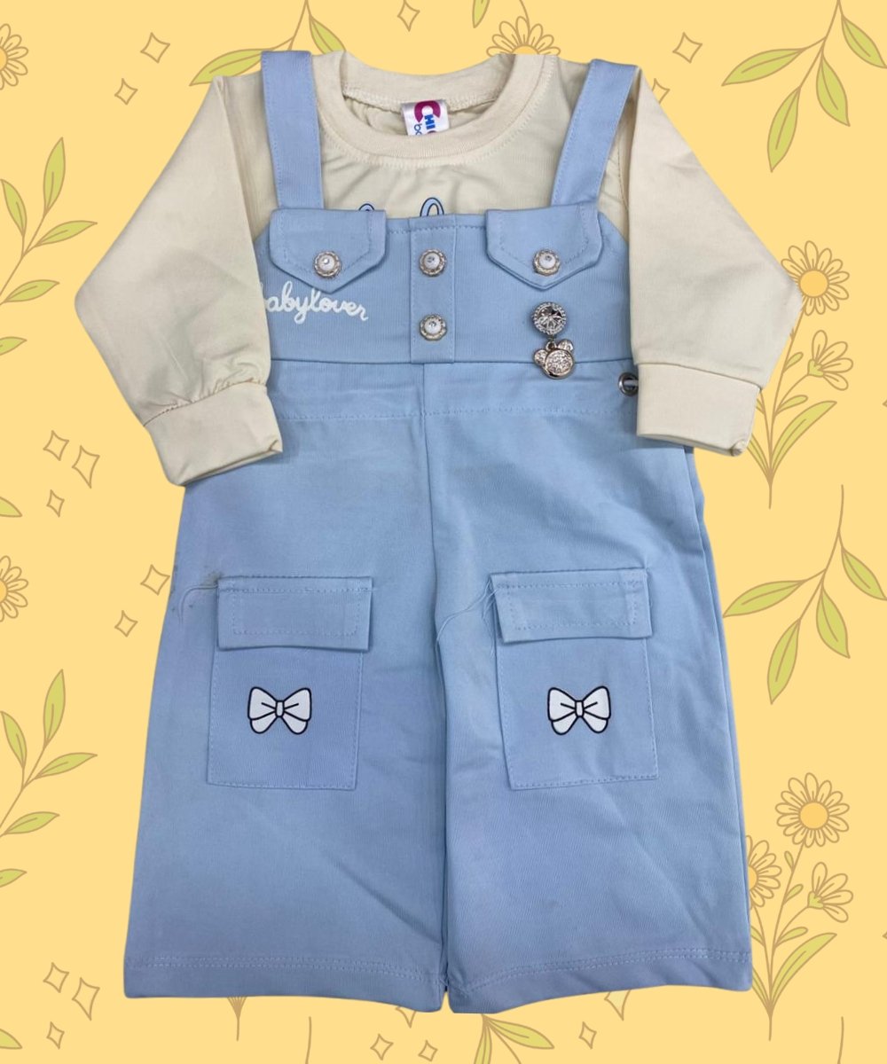 A sweet and stylish baby girl romper set featuring a soft inner top and a cute blue overall with bow pocket details—perfect for everyday comfort, playtime, and adorable outings.